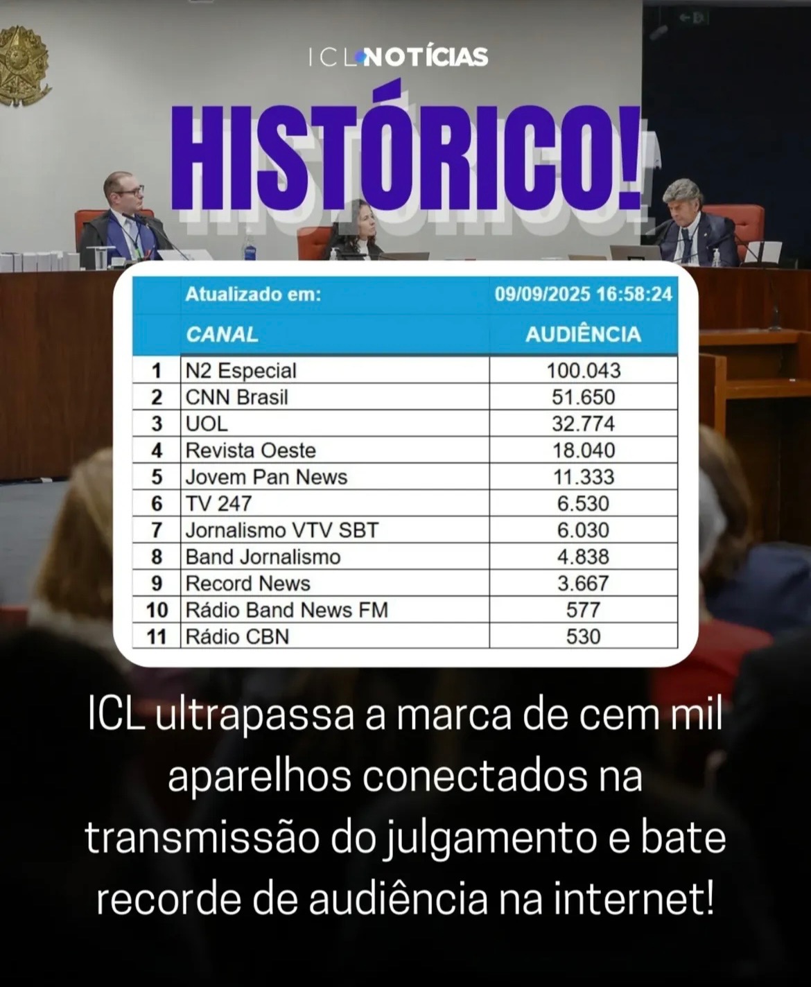O sucesso do Desperta ICL é evidente. Nos últimos meses, o programa registrou um salto significativo de audiência, alcançando no dia 11/09/2025 mais de 42 mil aparelhos conectados simultaneamente — o maior número da história do programa, consolidando nossa entrega de qualidade e credibilidade jornalística.